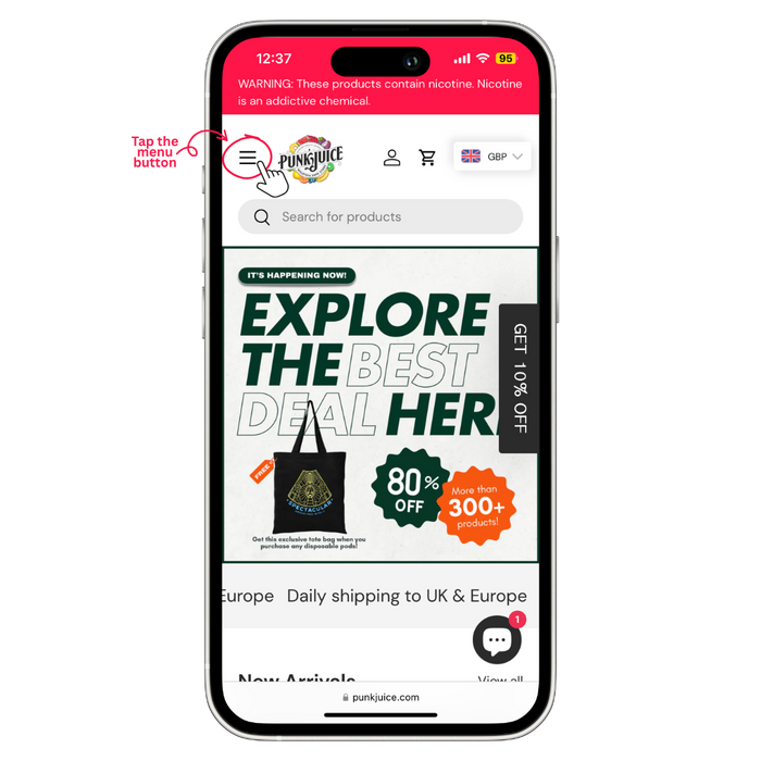 Enter the Punk Juice website and tap/click on the menu button at the top left of the screen